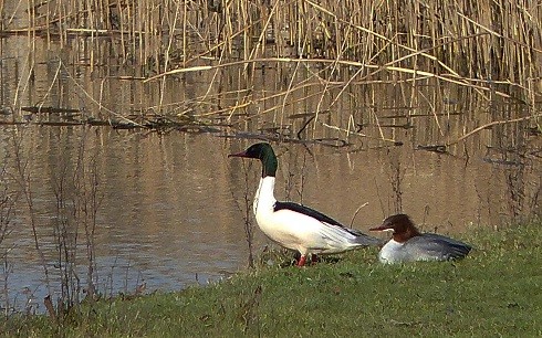 Left brief return of a pair of goosanders - male on left, female sitting down.